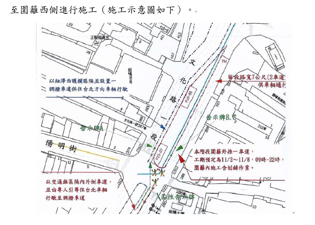板橋文化路一段(陽明街至民生路三段),今施工圍籬調整及道路標線改設